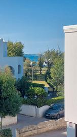 Appartamento vista mare con una camera con letto matrimoniale, soggiorno con divano letto matrimoniale, angolo cottura, bagno con doccia e lavatrice, aria condizionata nel soggiorno e in camera, Tv, phon e seggiolino da tavolo per bambini (su richiesta). Balcone vista mare laterale.