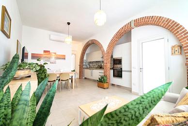 L'abitazione presenta un ampio soggiorno con eleganti archi, molto curato nei dettagli e progettato per offrire un ambiente accogliente e luminoso.