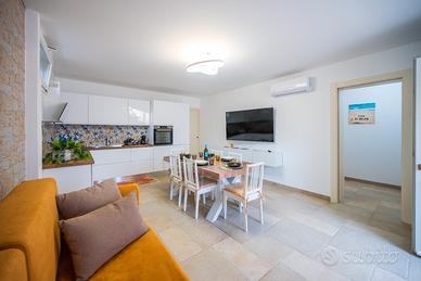 L'altra del piano rialzato ("Dimora Sole" - circa 55 mq.) è composta da camera con letto matrimoniale più lettino, disimpegno con divano letto doppio, sala da pranzo, cucinino, bagno, ampia veranda esterna coperta.