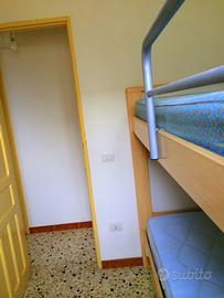 - **Primo piano (Zona notte):** Accesso tramite scala a chiocciola; disimpegno con posto letto, WC con lavabo, cameretta con letto a castello, ampia camera matrimoniale con materasso Permaflex e rete Ondaflex, vista mare dalla finestra. Posti letto totali: 5 (3 singoli, 1 doppio). Possibilità di aggiungere un letto singolo al piano rialzato per chi non può salire la scala a chiocciola.