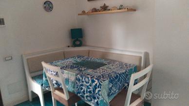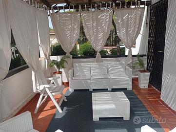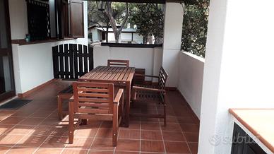 villetta in gruppo di 5 con parcheggio privato, mare a pochi minuti a piedi, 4-5 persone, stanza matrimoniale, stanza con due letti, soggiorno con divano letto, due bagni, cucina, doccia esterna con acqua calda. Terrazzo attrezzato con bbq e divanetti. Disponibile dal 1 al 15 agosto. 1..200 euro settimana di base. Affitto minimo una settimana.