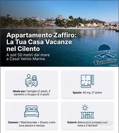 APPARTAMENTO ZAFFIRO - Marina di Casal Velino | 50 mt dal mare | Parco Privato Cerchi una vacanza rilassante a due passi dal mare del Cilento? L'appartamento Zaffiro, in Via Stromboli 20, è la soluzione ideale: situato al secondo piano all'interno di un parco privato, a soli 50 metri dalla spiaggia di Marina di Casal Velino. ? L'appartamento: o Superficie: ~40 mq, secondo piano o Soggiorno/cucina completamente accessoriato o Camera da letto matrimoniale o Divano letto da una piazza e mezza o Balcone arredato o Posto auto incluso ? Dotazioni: o Aria condizionata o Lavatrice o TV o Stoviglie e accessori cucina completi o Biancheria da letto e bagno disponibile (supplemento) ??????? Adatto per: o Coppia con 2 bambini oppure 3 adulti (max 4 persone) ? Animali ammessi (piccola taglia, educati) L'appartamento si trova in un contesto tranquillo e sicuro, immerso nel verde del parco privato, perfetto per chi vuole godersi il mare senza rinunciare al comfort. Arioso, luminoso e funzionale. ? Contatti e prenotazioni: WhatsApp Business: 333 993 8282 Mobile: 328 345 2547