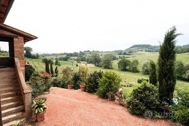 Edificio principale al piano terra una taverna rustica molto accogliente con camino, una cucina con lavastoviglie, un bagno di servizio adibito a lavanderia, una stanza rustica adibita a sala da pranzo, angolo con servizio internet gratuito, due camere matrimoniali ciascuna con bagno con doccia ed esternamente angolo giardino con veduta su Chiusi. Al primo piano con ingresso da una loggia un soggiorno, un angolo cottura con lavastoviglie e due forni, due camere matrimoniali ciascuna con bagno con doccia, due camere doppie o matrimoniali ciascuna con bagno con doccia.
