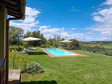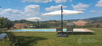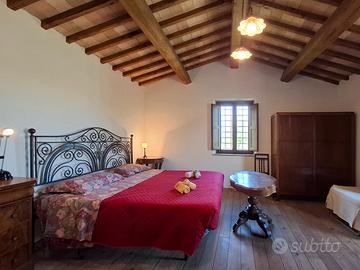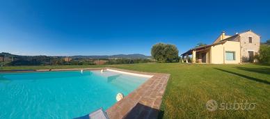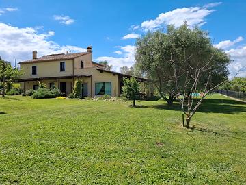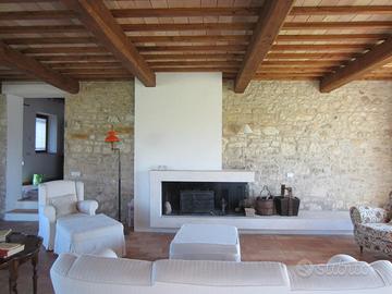 Nel verde e nella quiete delle colline umbre al confine con il Lazio, antico CASALE panoramico su due livelli, con piscina (12,5x4 mt - h acqua 1,35 mt) a 30 minuti dal Grande Raccordo Anulare di Roma, immerso in 5000 mq di giardino con alberi da frutta, uliveto e parcheggio, ristrutturato ed arredato con eleganza (travi legno, pavimenti cotto, marmi travertino, mobili d'epoca), in uso esclusivo: