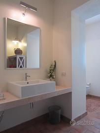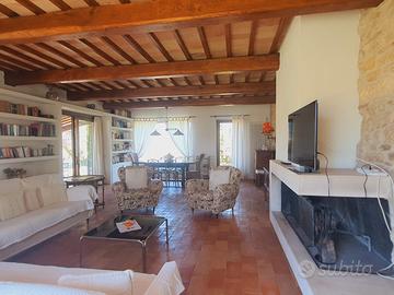 5 camere per dormire (3 con, ciascuna, un letto matrimoniale ed un letto singolo; 2 con divani letto doppi, uno nel salone e uno nell'altro nel salotto); spaziosa cucina abitabile attrezzata; 2 bagni con doccia, ecc.; + portico di 55 mq., grande terrazza panoramica di 35 mq, loggia, + 5.000 mq. con giardino con alberi da frutta, uliveto, area parcheggio ecc.