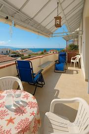 ? Ampio terrazzo vista mare attrezzato con tavolo, sedie, lettini e sdraio per pranzare all'aperto e rilassarsi ammirando il tramonto
