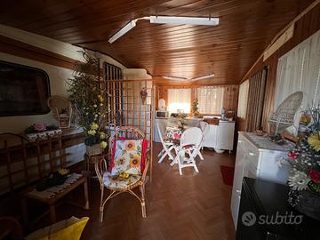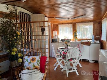 Vendo casetta completamente ristrutturata in campeggio con roulotte con 4 posti letti: un letto matrimoniale con rete e materasso + un salotto che si trasforma in letto. La casetta e' composta da un salottino, cucina e angolo bagno chimico. Vendo tutta completa come si trova. Il campeggio "la Madunina" sito a Varano Borghi (VA) sul lago di Comabbio, è aperto 11 mesi all'anno, e' dotato di posteggio, ristorante e piscina. Prezzo €. 7.000,00