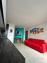 Appartamento bilocale piano terra, con soggiorno con cucina a vista e divano letto matrimoniale, camera da letto con letto matrimoniale, bagno con doccia. Ottimo per famiglie da 4 persone, super comodo per coppie. Riscaldamento autonomo e aria condizionata anche con pompa di calore. WiFi gratuito in tutto l'appartamento. Smart Tv.