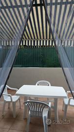 Grande TERRAZZO (lato giardino) arredato con tavolo e sedie, tenda da sole avvolgibile.