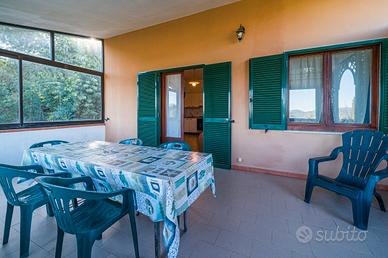 Appartamento posto al primo piano composto da soggiorno con angolo cottura e due divani letti singoli, camera matrimoniale, bagno con doccia senza bidet e grande terrazza verandata attrezzata per mangiare.