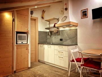 Letto matrimoniale mobile a scomparsa e divano con 2 posti letto, di cui uno a castello, cabina armadio, angolo cottura completamente attrezzato con piano di cottura elettrico in vetroceramica e forno a micro-onde, TV digitale terrestre. Il bagno con box doccia e asciugacapelli è ampio e dotato di ampia finestra. Armadietto per deposito sci e scarponi in skiraum condominiale. Parcheggio privato esterno. Ristoranti e pizzerie, negozi e noleggi a pochi metri. Palazzetto del ghiaccio e bellissima piscina semi coperta Dolaondes con annesso centro benessere, a pochi minuti.