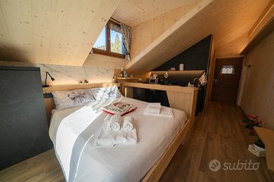 Il soggiorno, elegante e accogliente, è impreziosito da un caminetto, ideale per rilassarsi nelle giornate più fresche, leggere un libro o godersi momenti di quiete dopo una giornata trascorsa tra sentieri, escursioni o attività all'aria aperta. La presenza di una piccola cucina, funzionale e ben integrata nello spazio, consente di preparare colazioni o pasti semplici in totale autonomia.