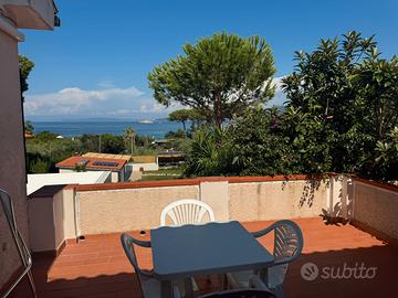 Doppio terrazzo solarium (uno con tenda e l'altro con ombrellone) vista mare, dove poter prendere il sole in totale privacy, con tavoli, sedie e lettini prendisole, doccia esterna, barbecue, e posto auto privato.