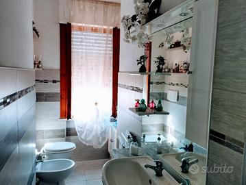 Il bagno con finestra è dotato di doccia a pavimento, wc, bidet, scalda salviette e mobile lavandino con specchio a muro e altro balcone.