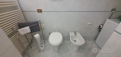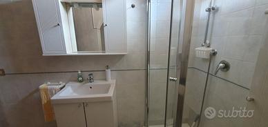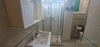 Il bagno è dotato di doccia con box di cristallo, wc, bidet, lavandino con specchio a muro.