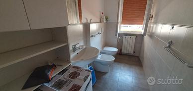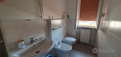 Il bagno con finestra è dotato di doccia a pavimento, wc, e bidet.