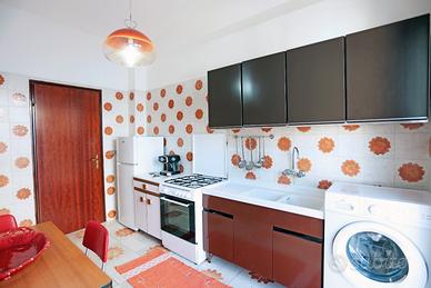 L'alloggio, al primo piano della struttura, può ospitare fino a 5 persone ed è composto da: terrazza abitabile con vista mare (con dondolo, tavolo, sedie e barbecue), una camera tripla e soggiorno con divano letto a una piazza e mezza (110 cm) e TV 55 pollici full HD, cucina abitabile attrezzata (con lavabiancheria) e bagno completo con doccia. La camera tripla e il soggiorno sono climatizzati (con inverter caldo/freddo) mentre, in ogni ambiente, sono stati collocati ventilatori a soffitto telecomandati con pale in legno. L'appartamento è completamente arredato (in stile vintage anni 80) ma è dotato di tutti gli elettrodomestici (nuovi da fabbrica) con set completo cucina, stoviglie e posateria. Connessione internet WIFI flat.