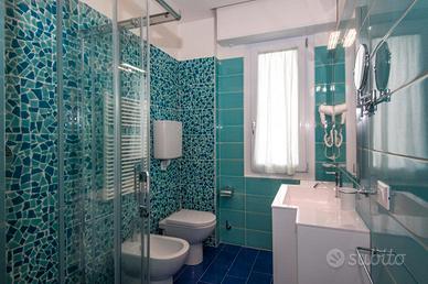 L'appartamento inoltre è dotato di: serramenti in PVC con vetri antisfondamento, boiler elettrico da lt. 80, lavatrice, lavastoviglie, cucina a gas a quattro fuochi, microonde, frigorifero con cella freezer, phone e termo elettrico in ogni bagno, persiane elettriche, cassaforte murale, porte in legno da cm. 80, portoncino d'ingresso con sei chiusure in acciaio, porta valigie in PVC, vettovaglieria per 6 persone, tenda da sole elettrica e codice privato per punto internet / wifi e TV satellitare.