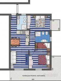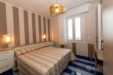 Altra camera con letto matrimoniale, attrezzata con parete armadio di ca. mt. 2,20, testiera in rovere con due aplique e luci direzionali, nonché porta finestra con altra terrazza vista mare di mq. 2,50. Posto auto privato in garage condominiale h: 1,85.