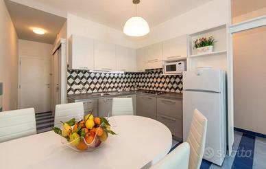L'appartamento inoltre è dotato di: serramenti in PVC con vetri antisfondamento, boiler elettrico da lt. 80, lavatrice, lavastoviglie, cucina a gas a quattro fuochi, microonde, frigorifero con cella freezer, phone e termo elettrico in ogni bagno, persiane elettriche, cassaforte murale, porte in legno da cm. 80, portoncino d'ingresso con sei chiusure in acciaio, porta valigie in PVC, vettovaglieria per 6 persone, tenda da sole elettrica e codice privato per punto internet / wifi e TV satellitare.