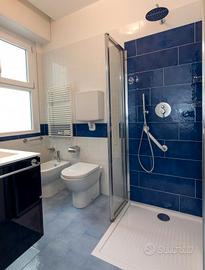 Nel 2° bagno a giorno finestrato, per agevolare le persone con difficoltà di movimento è stato installato un piatto doccia a filo pavimento da cm. 90 x cm. 90 con due ante estensibili, seggiolino e maniglione.