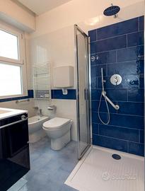 Nel 2° bagno a giorno finestrato, per agevolare le persone con difficoltà di movimento è stato installato un piatto doccia a filo pavimento da cm. 90 x cm. 90 con due ante estensibili, seggiolino e maniglione.