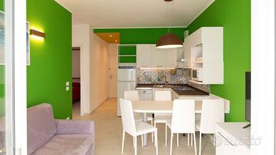 ampio soggiorno con angolo cottura dal quale si può accedere direttamente alla terrazza fronte piscina vista laterale sul mare di ca. mq. 5,50, TV color e divano; un bagno a giorno, completamente accessoriato, con box doccia angolare, cm 90 x 90.