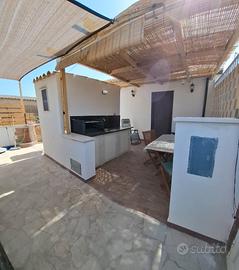 La struttura è così composta, camera da letto matrimoniale con un letto a castello con servizio igienico in camera, cucina attrezzata, terrazzo attrezzato con barbecue e piano di lavoro, tavolo e sedie, sdraio,doccia esterna e presenta un servizio igienico esterno con wc e doccia. Giardino privato con alberi di limone e mandarino,spezie e fiori ornamentali. Posto auto interno protetto da vela per garantire l'auto all'ombra.