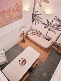 Soggiorno open space, cucina con elettrodomestici, piano a induzione, letto matrimoniale sul soppalco .