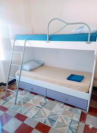 Questa casa indipendente, con ingresso privato, si sviluppa su due piani. Al primo livello si trova una cucina completamente attrezzata, un'accogliente zona giorno e un terrazzo esterno, perfetto per cene e pranzi all'aperto. Al secondo livello, una camera matrimoniale arredata, una cameretta con letto a castello e un bagno completo garantiscono un soggiorno confortevole.