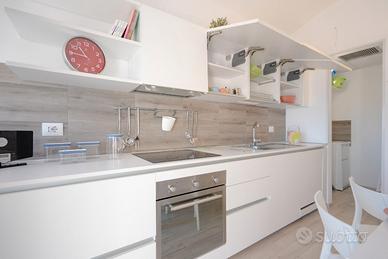 Ampio soggiorno con funzionale e grande angolo cottura con piano fornelli, cappa aspira odori, frigorifero, forno, lavastoviglie, macchina elettrica del caffè, stoviglie, tovagliato, suppellettili, servizi piatti, tazze e bicchieri.