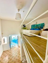 La casa offre due ambienti ampi e indipendenti, ciascuno con bagno privato e soppalco che separa zona giorno e zona notte.