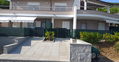 Appartamenti panoramici, antisismici, immersi nel verde e nella tranquilltà, per 6 ed 8 persone, con sogg./pranzo e a.cottura, 2 e 3 camere, 2 bagni, veranda arredata, locale lavatoio/doccia, giardino recintato e posto auto coperto.