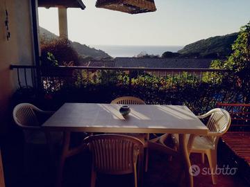 Terratetto con affacci panoramici vista mare sulla verde baia di Nisportino inserito in complesso di recente costruzione . Ingresso indipendente con giardino frontale oltre terrazza abitabile per mangiare sul lato tergale con affaccio sul golfo. La piscina sottostante che appare in foto non è usufruibile , L altra all interno del villaggio da concordare con la proprietà .