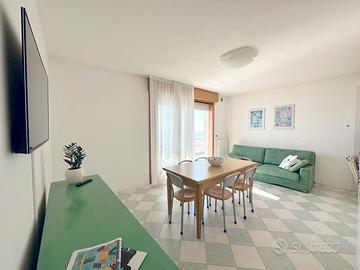 Residence Villa Elsa di recente ristrutturazione fronte mare in Piazza Mazzini con 2 piscine (una per adulti ed una per bimbi). Appartamento al 4° piano con ascensore, composto da soggiorno/pranzo con angolo cottura e divano letto singolo, una camera matrimoniale e due camere con due letti singoli ciascuna, due bagni con box doccia ed ampio terrazzo panoramico attrezzato fronte mare. L'appartamento è dotato di aria condizionata, lavatrice, lavastoviglie, microonde, TV, cassaforte e porta blindata. N.2 posti auto (uno nel seminterrato e uno in superficie scoperto). N.1 posto spiaggia presso il Consorzio Mazzini. Totale posti letto:6+1. Non sono ammessi animali. Consumi elettrici extra, circa ?30/50 la settimana. Per info contattare 0421972692.