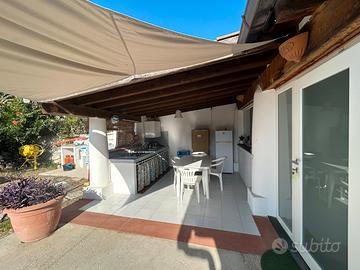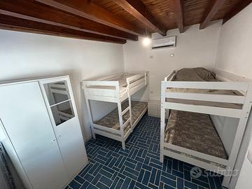 La casa consiste in 2 camere: una con il letto matrimoniale e un lettino e altra con 2 letti a castello. In tutto ha 6 posti letto. Ci sono 2 condizionatori, frigorifero e tv.