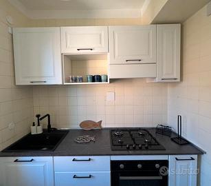 La cucina, piccola ma funzionale dispone di piatti, pentole, bicchieri, tazze da caffè e da latte, forno e microonde.