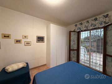 Dal disimpegno si accede alla camera da letto matrimonale e una camera da letto piu piccola con letto matrimonale. Sul retro secondo giardino (70 mq circa) pavimentato con lavanderia e BBQ.