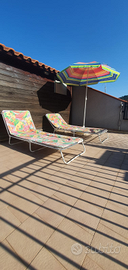 Terrazzo attrezzato di sdraio, ombrelloni barbecue e casetta in legno attrezzata di cucinino.