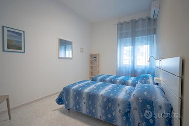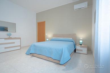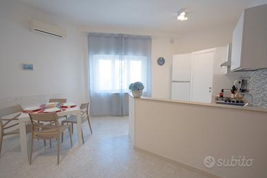 "La Dimora di Mezzo", 70 mq, ospita al massimo sei persone. Si compone di due stanze da letto, una con letto matrimoniale, l'altra con due letti singoli, componibili in matrimoniale. Disponibile anche un comodo divano letto nella zona giorno. Tutti i letti sono forniti di biancheria con cambio settimanale. Ampia la zona giorno con un funzionale ripostiglio ed un ampio angolo cottura con piano fornelli, cappa aspira odori, frigorifero, forno, friggitrice ad aria, lavastoviglie, macchina elettrica del caffè e moka; tovagliato, pentolame, stoviglie, posate e suppellettili. L'appartamento è fornito di lavatrice, ferro ed asse da stiro, stendino; aspirapolvere, scope, scopettoni, secchi e bidoncini per la raccolta differenziata. Bagno con vasca, doccia e servizi, asciugacapelli e kit teli da bagno personale. Aria condizionata in tutti gli ambienti, autoclave, WiFi e TV a schermo piatto. Rilevatori fumo, rilevatore gas ed estontore. Accoglienza ed assistenza staff Promomax.