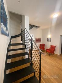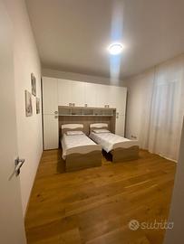 Presente anche un piccolo bagno di servizio. Salendo le moderne scale e andando al piano di sopra, troviamo due camere da letto, una matrimoniale con bagno in camera, e una con due lettini singoli, bagno annesso.