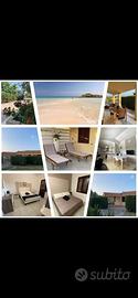 Veranda mq. 50 con tavoli e sedie per cenare, lettini in teak con cuscino e vista della Torre di Chia