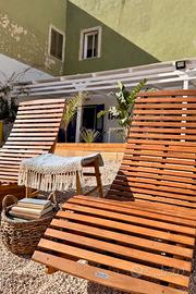 Fuori ti aspetta un giardino curato con piante tropicali, una veranda in legno con tavolini eleganti, perfetti per un aperitivo al tramonto.