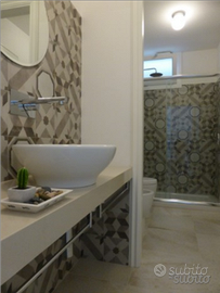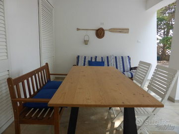 La struttura si sviluppa su due piani ed è circondata da ampi spazi che comprendono parcheggi interni alla recinzione, un boschetto privato, due barbecue in muratura, due impianti di docce calde esterne e un grande orto sul retro. L'appartamento "Lu Mare" si trova al piano terra e dispone di due camere matrimoniali, una cucina attrezzata con forno, frigo e freezer, un grande bagno , tv , aria condizionata e una veranda privata attrezzata per cenare all'aperto in completa tranquillità, dove gli ospiti possono godersi il clima mite del Salento. Di fronte all'appartamento c'è una piccola costruzione con una lavatrice.