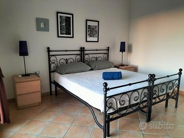 Due camere da letto, una matrimoniale e una con letto alla francese più eventuale poltrona futon, bagno con doccia e lavatrice, zona giorno con angolo cottura con piastra a induzione, penisola, piccola TV, divano e zona pranzo, il tutto affacciato su una veranda che prosegue nel giardino.