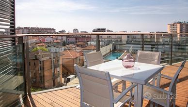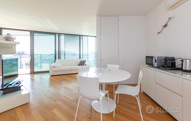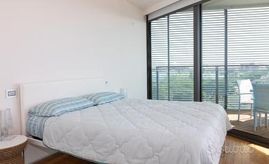 Affittasi stupendo appartamento dalle linee moderne e rifiniture di pregio. Questo appartamento dall' arredo curato e raffinato si trova al quarto piano della prestigiosa Torre Aquileia. La Torre si trova tra Piazza Mazzini e Piazza Internazionale, a pochi passi dal mare. L'appartamento è composto da ampia zona giorno (con eventuale divano letto matrimoniale), 1 camera matrimoniale, 1 camera con 2 letti a castello, 1 bagno con doccia, terrazzo vivibile dove è possibile pranzare, cenare o prendere il sole con vista panoramica.