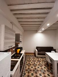 L'appartamento del piano superiore è composto, invece, da un ampio spazio giorno con cucina attrezzata e divano a uso letto singolo e grande camera da letto matrimoniale e bagno.