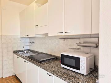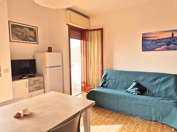 Appartamento composto da soggiorno con cucinotto, divano, 1 camera matrimoniale, 1 camera con due letti singoli, bagno con box doccia e terrazzo. Parcheggio coperto e numerato.