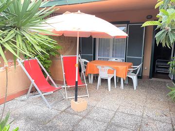 - Portico/giardinetto privato recintato con cancello, attrezzato con ombrellone, sedie a sdraio, tavolo e sedie per mangiare all'aperto e per momenti di relax
