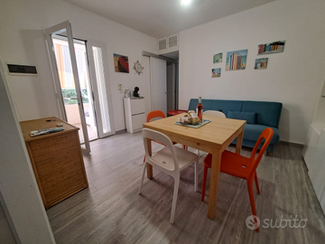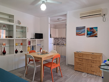 Appartamento, 5 posti letto in complesso residenziale attrezzato, a pochi metri dal mare e dal corso principale. Composto da ingresso soggiorno, cucinino, camera matrimoniale, cameretta doppia, bagno con box doccia e terrazzino attrezzato.